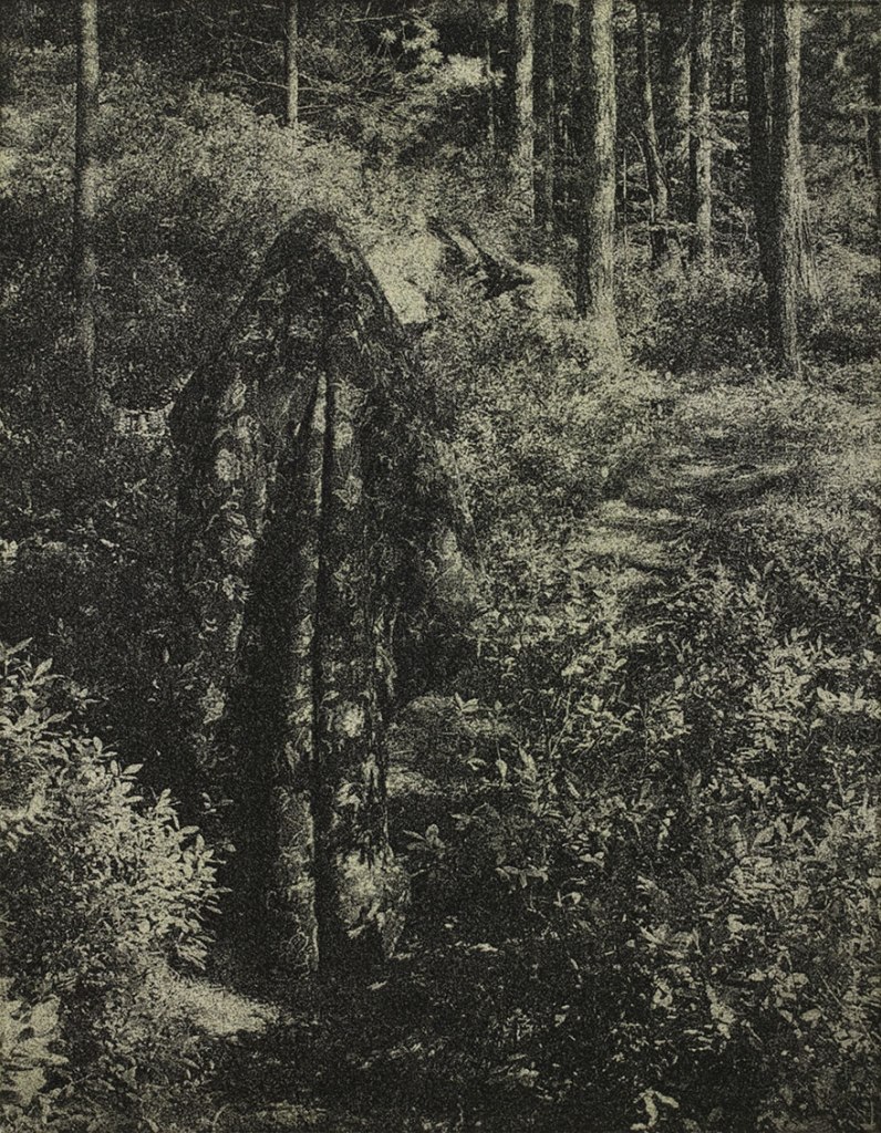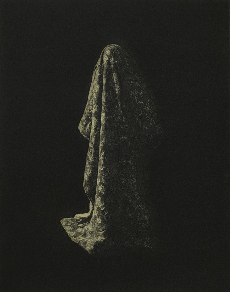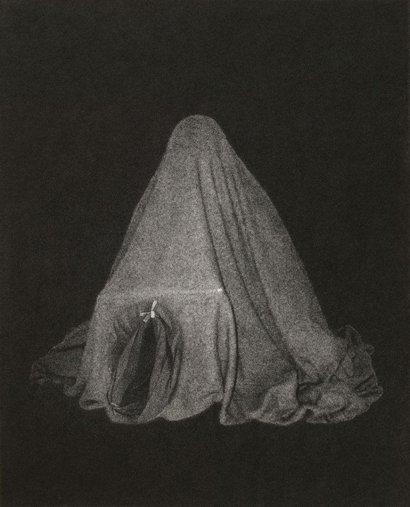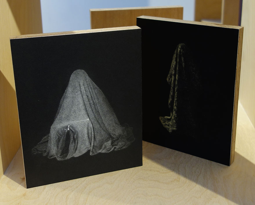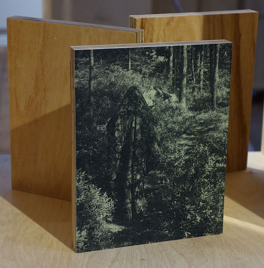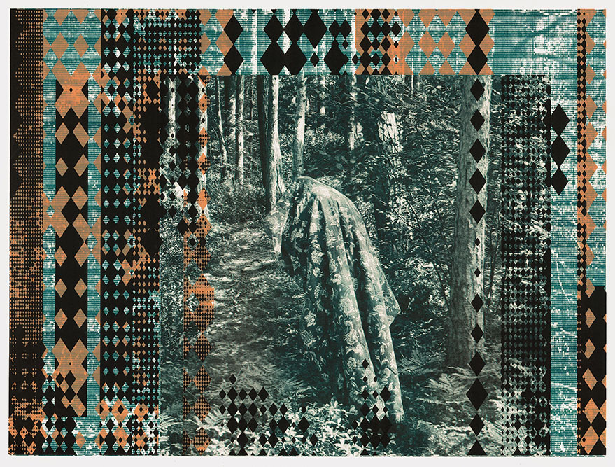 Continuing earlier investigations of covered or hiding figures representing the ‘other’ this series is largely based on scenes the artist staged in remote woodland in Canada. The images are deliberately ambiguous, leaving us uncertain of the nature or purpose of what confronts us. In the later works pattern disrupts the images, distancing us from the figure.
